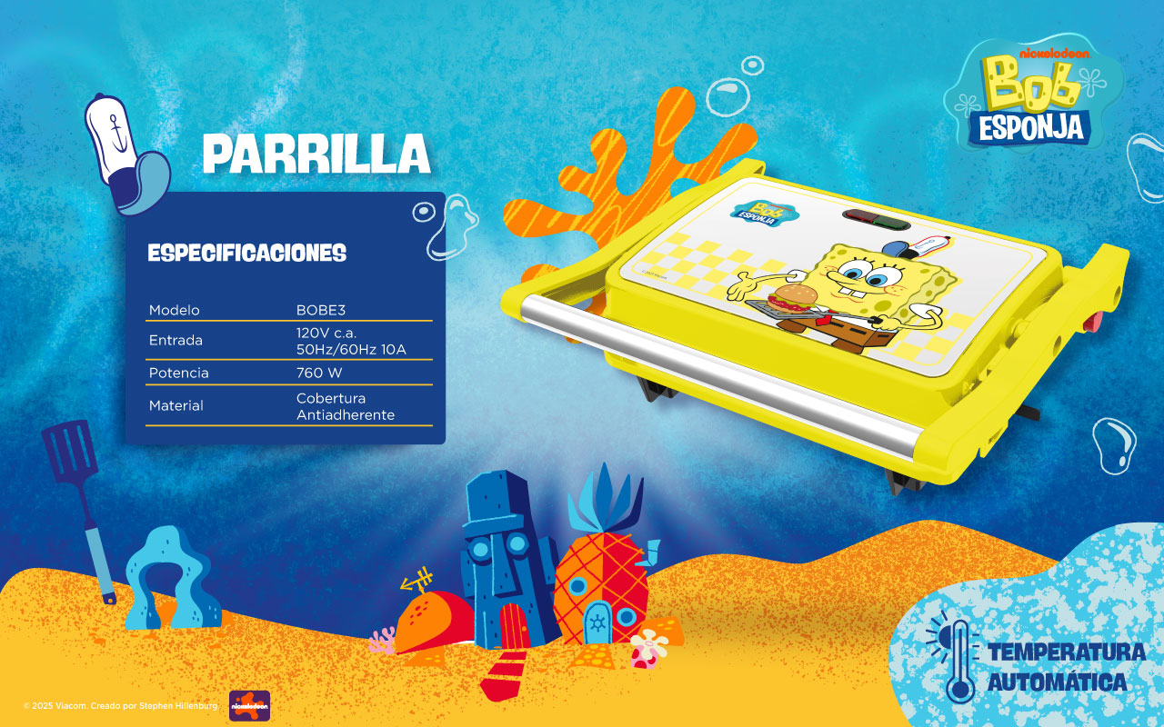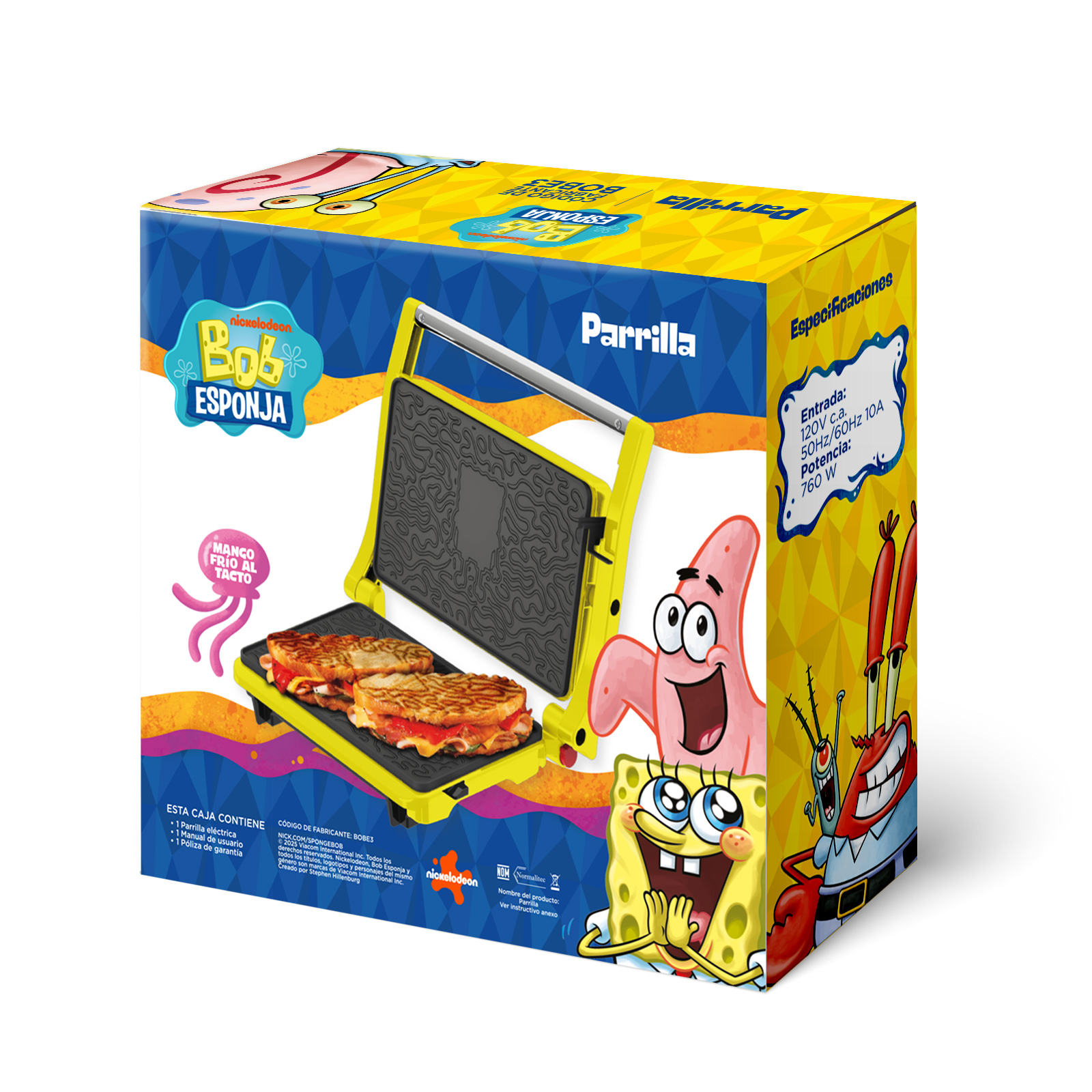 La Parrilla Bob Esponja combina funcionalidad y diseño en un práctico electrodoméstico ideal para preparar alimentos de manera rápida y uniforme. Su acabado en color amarillo con detalles del personaje la convierte en una pieza llamativa que aporta un toque distintivo a tu cocina.