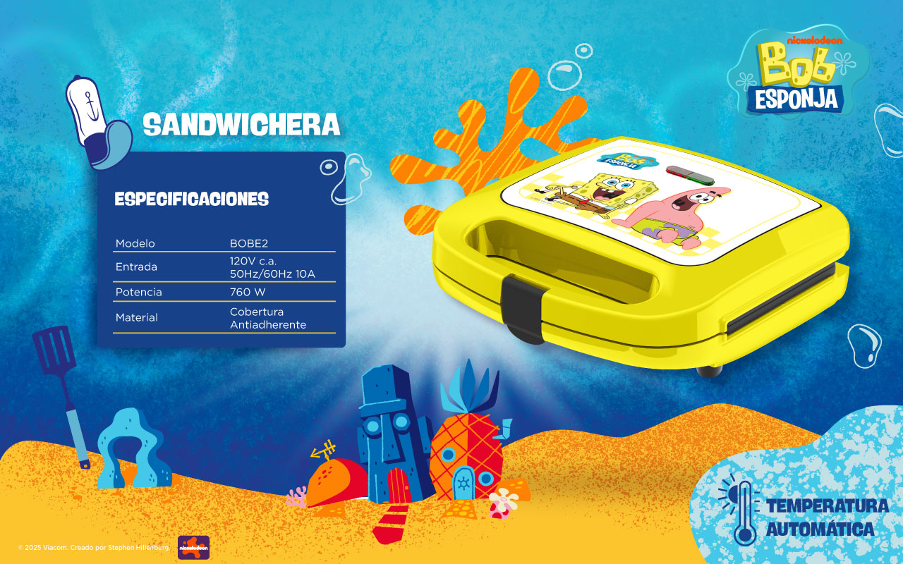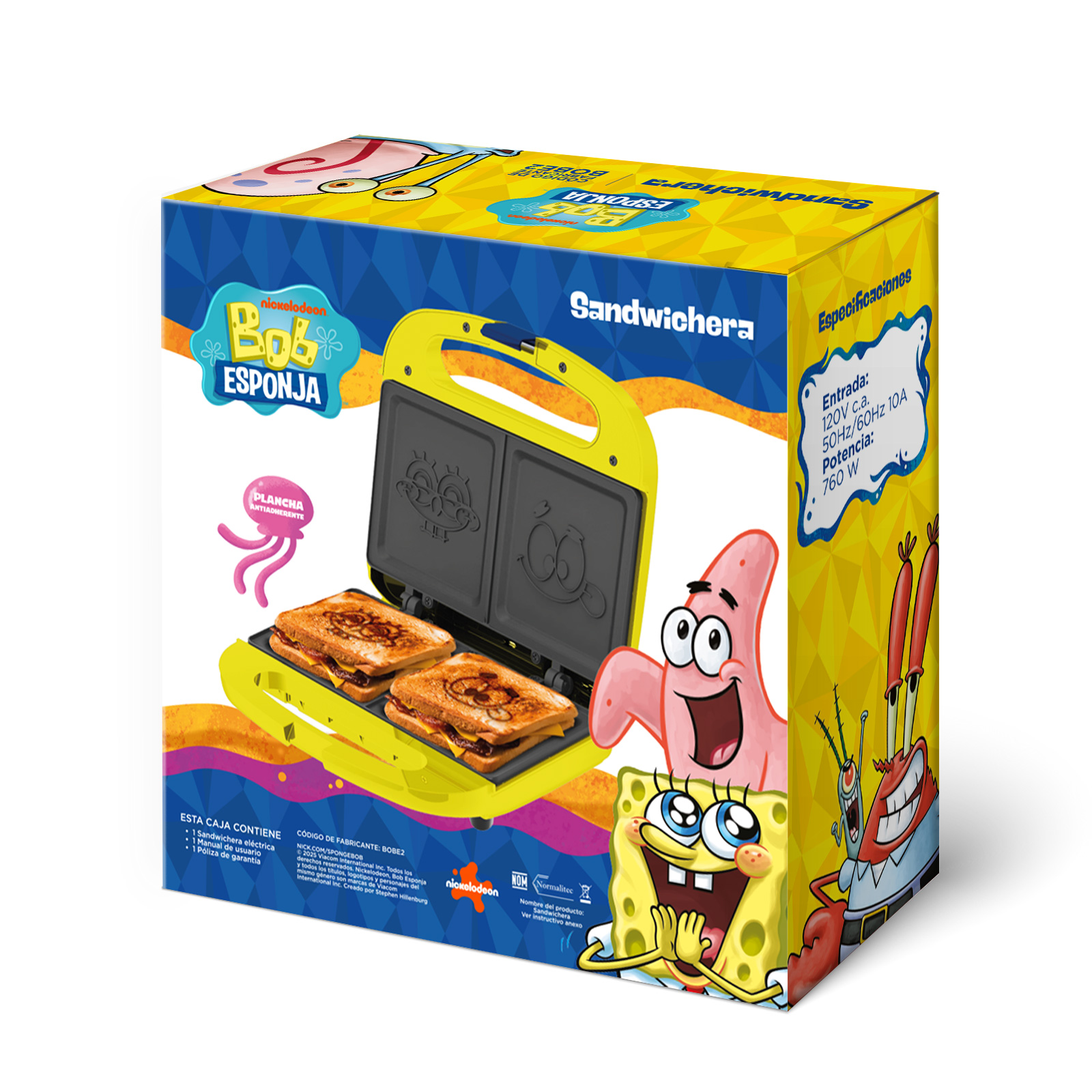 Prepara deliciosos sándwiches de forma práctica y rápida con la Sandwichera Bob Esponja, un electrodoméstico funcional con un diseño inspirado en el personaje más querido del fondo del mar. Su estructura compacta y ligera la hace ideal para cualquier cocina, combinando estilo y eficiencia.